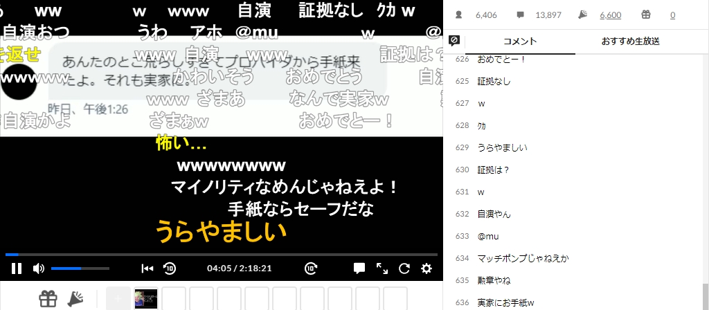 「あの~、俺の配信でザンネンながら荒らしまくってた人がいたらしく、なんとその人ね、なんとですね、この人なんと、荒らしまくってた人からDMが来てましたが、荒らしまくったせいで、なんと、プロバイダからお手紙が来たようです。しかも実家に。みなさまも気を付けてください。荒らしすぎるとこの人みたいに実家に直にプロバイダから来てネットが止められると、そういうことになりますので、家族に迷惑かけたくなければ荒らすのやめてくださいと、そういう所存でございますよ」