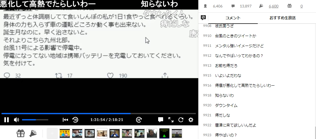 「とある女性配信者がちょっと心配になってさ。みんなも知ってると思うんだけど堀田君。堀田君ちょっと心配になってさ、マジで。なんかツイートも前さ俺が堀田君体調悪くて結構病気なんだって話したじゃん?堀田君がやばくなっててさ、たぶんメンタルのほうやられてると思ってるんだよな。痔が悪化とかそんなくだらん理由じゃない。もちろん痔はね、ヤバイんだけどさ。もうね、なんか飯も喉を通らない状況らしいんだよどうやら」