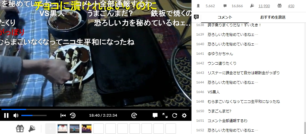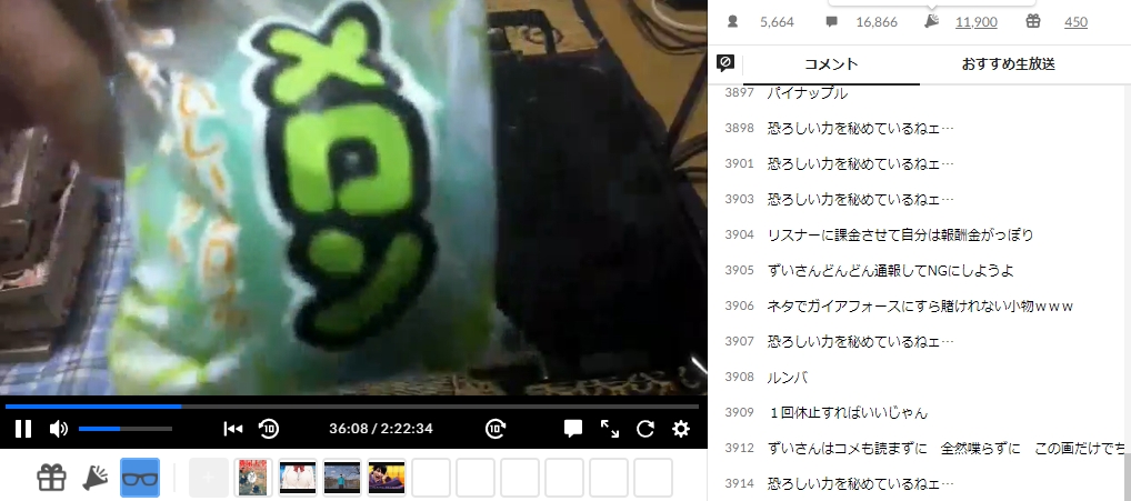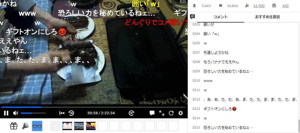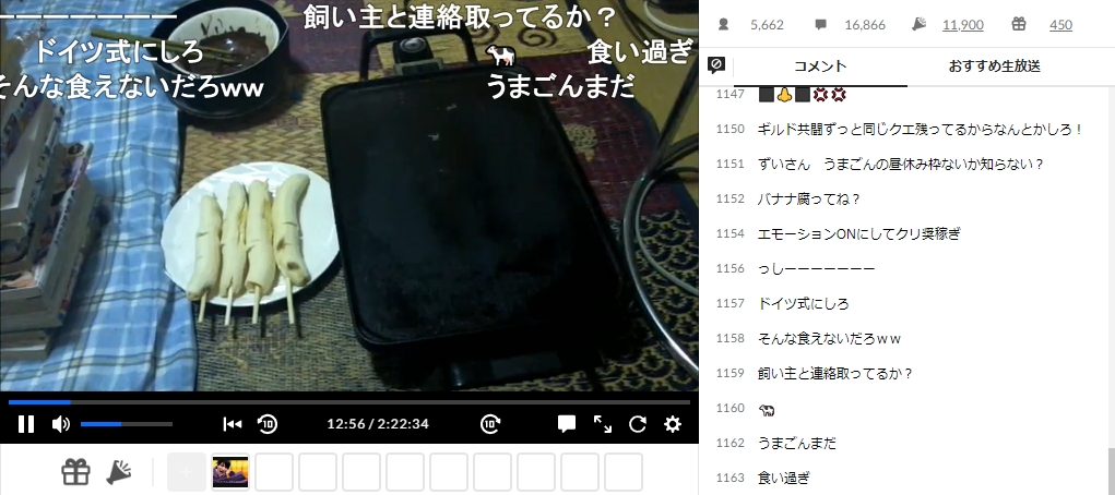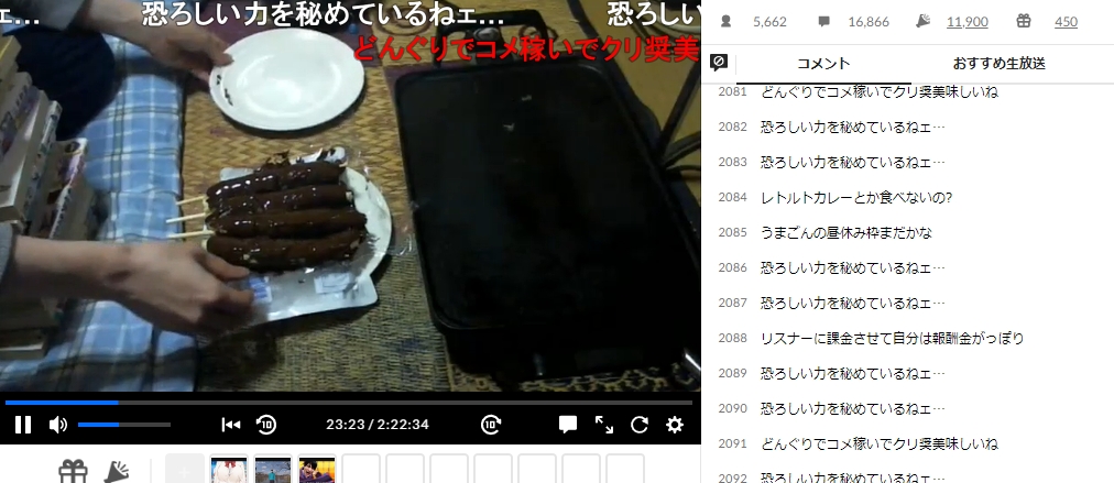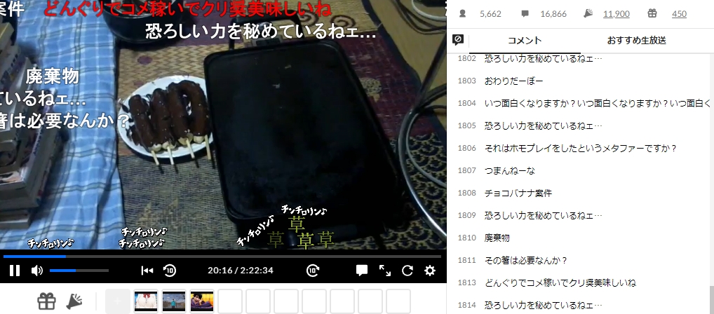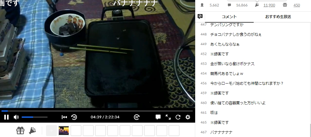 「チョコバナナくらいしか食うもんないもん。チョコバナナくらいしか食うもんないもん。チョコバナナくらいしか食うもんないもん。食うもんないもんマジで。チョコバナナくらいしか。これしか食うもんないもん」